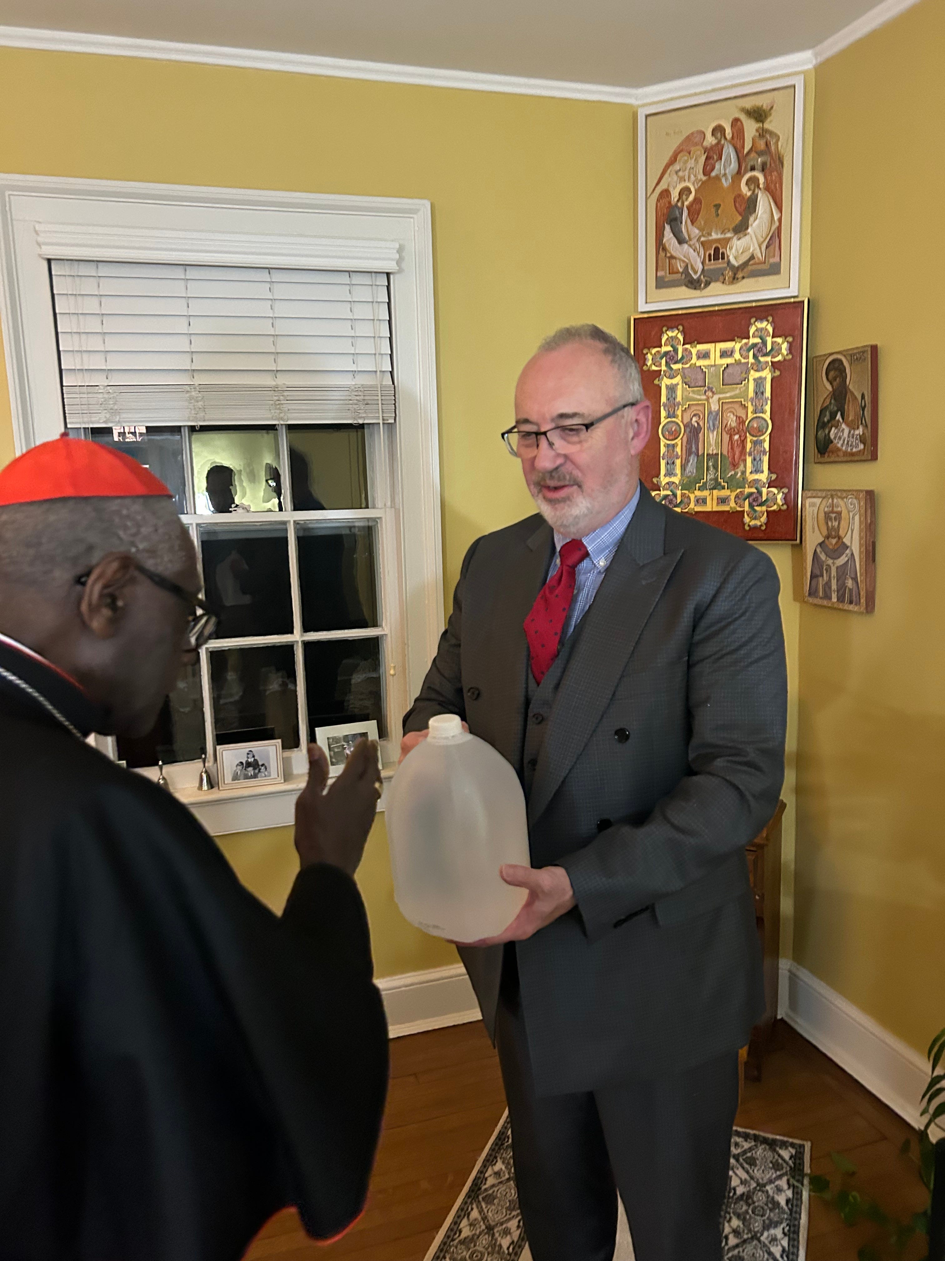 Here I am, holding his book “God or Nothing” and standing in front of our home icon corner. As David explains to all our guests, the images of the Trinity, the Crucifixion, the Face of Christ, Mary, the Mother of God, the saints and prophets are the sacred center of our home. But, notice the plans. And the family photos. The faith shines out into the world, pulling all of God’s creation back towards its destiny. Cardinal Sarah kindly blessed gallon of water so that we have holy water for anyone who enters our home.