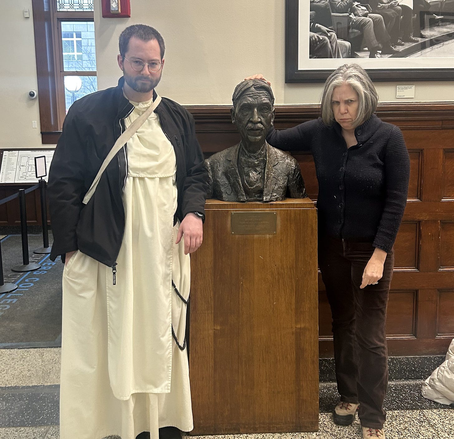 As I entered ‘the lion’s den’, I posed for this picture at Dewey’s bust. Why am I frowning? I admit—I was fearful I’d be ridiculed or mocked for my talk, which explicitly contrasted Dewey with Catholic philosopher Jacques Maritain.