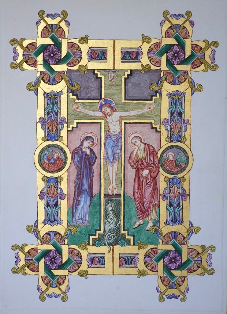 The Crucifixion and St Chad were painted especially for this occasion. Each artist was asked to draw personal inspiration from the English gothic style of the School of St Albans of the 13th century, a period when the Sarum Use Liturgy was at its height. This tradition of sacred art is characterized by the description of form with the elegant flow of line, a limited palette with muted colour, and by having ornate, patterned borders.