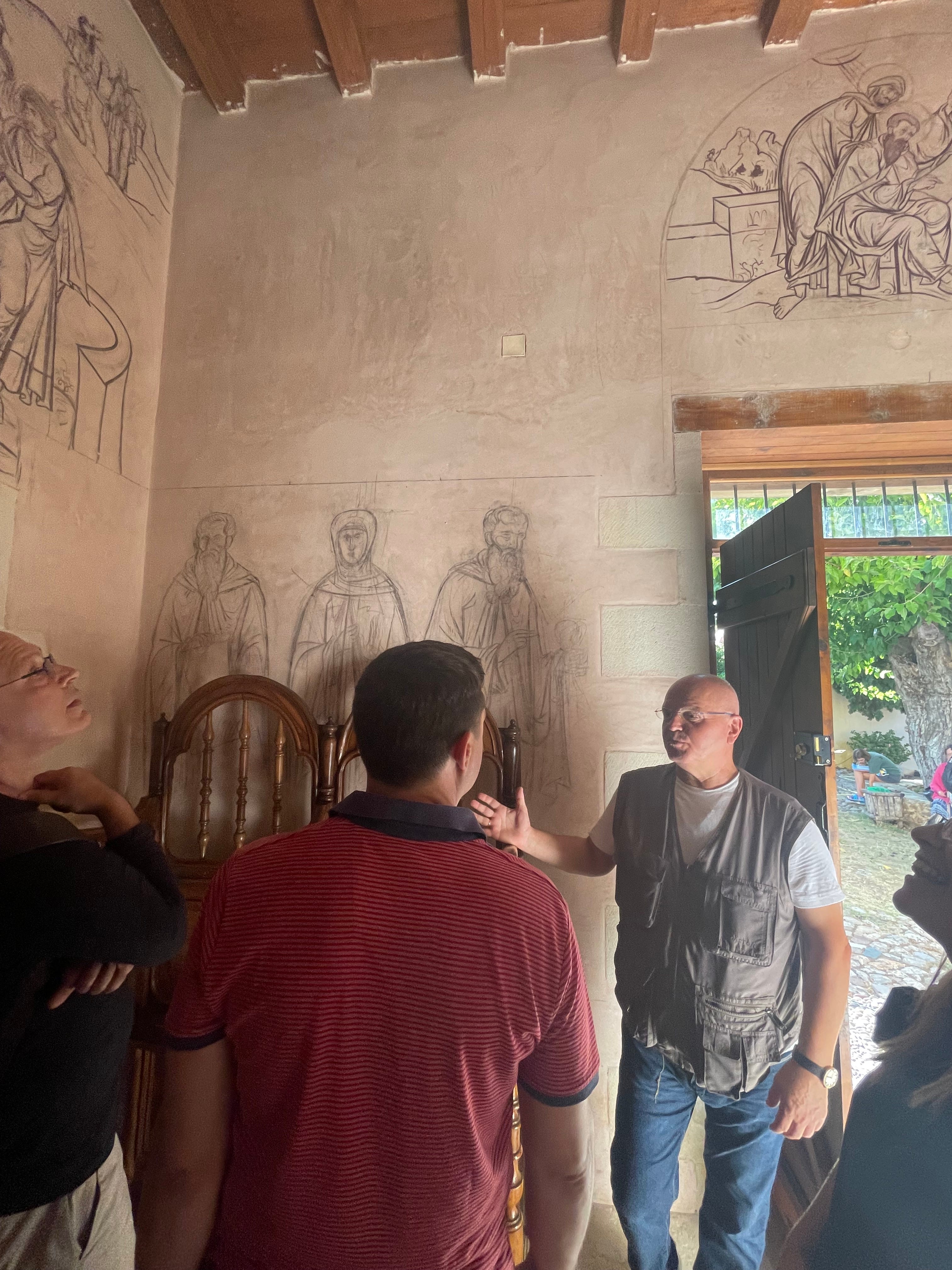 When David was invited to give a few talks to aspiring artists at an icon workshop in Crete in the summer of 2025, I begged to go along. I was picturing myself as an observer, sneaking off to the beach or the monastery as the art lessons taught by George Kordis would happen. But, I was invited to be in the art lessons, which are for beginners. “They don’t understand,” I thought, “I’m not a beginner at art. I’m below a beginner—I’m remedial!”