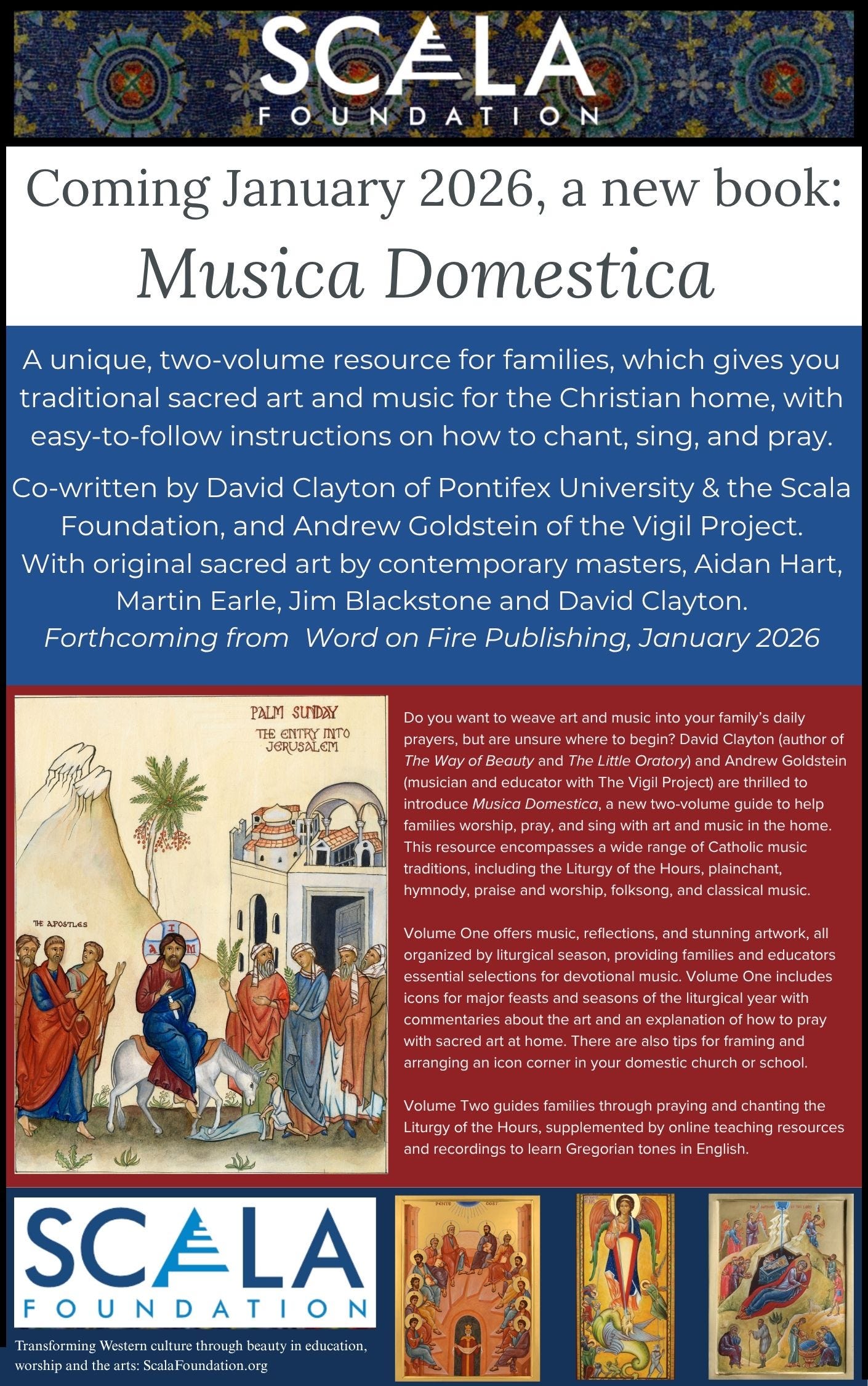 Since David and I got married in July 2022, we have sung the liturgy of the hours at home. I’m delighted that in January 2026 Word on Fire publishers will published David’s book Musica Domestica, co-authored with Catholic musician Andrew Goldstein of The Vigil Project and featuring original art by master artists Aidan Hart, Martin Earle, Jim Blackstone and David Clayton!
